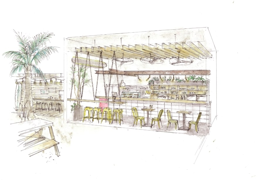 ランチではローカルユーザーからサーファーも満足できる地元の食材、旬の食材を使ったピザやラップサンドなど、他にもスペシャルなデザートや気軽なカフェメニューも販売予定。