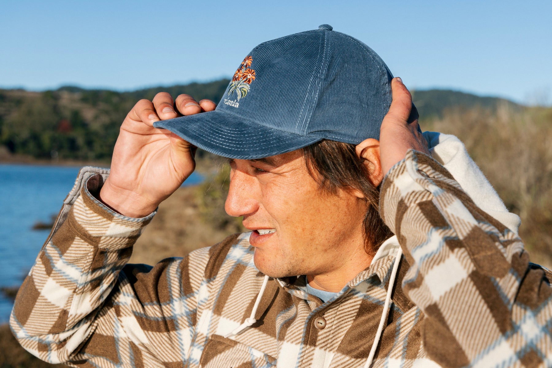 クラシックハット。コーデュロイ素材を使用、5パネル、刺繍ロゴ、移動カンアジャスターが特徴。